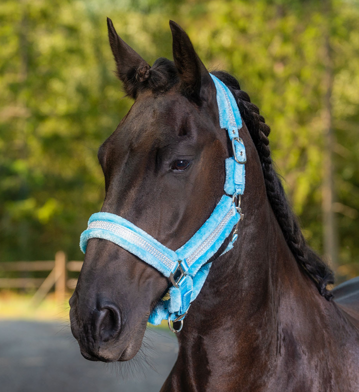 Denna grimma är även designad med strass och piléfodring ton i ton på nacke, nos och sidostycken.